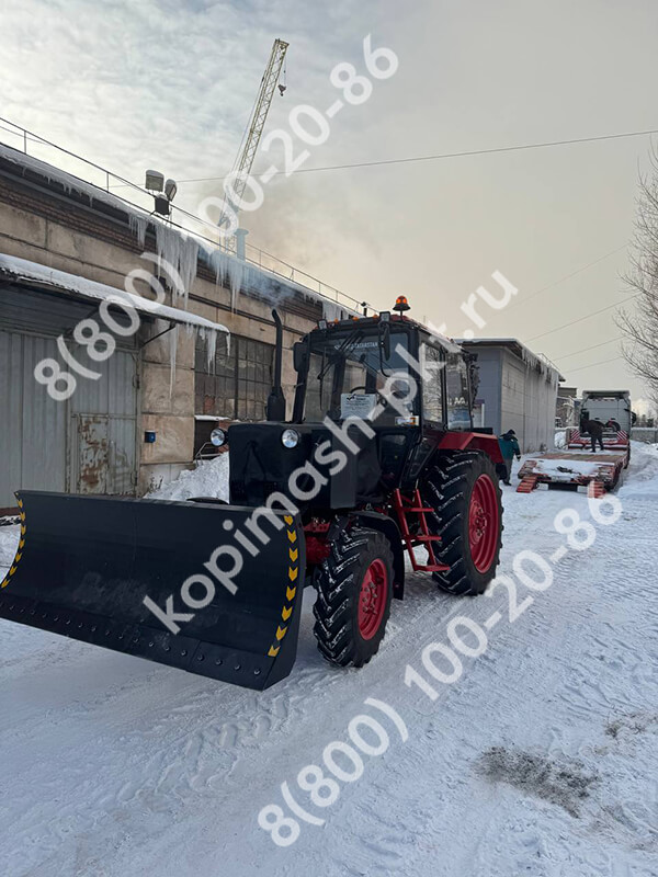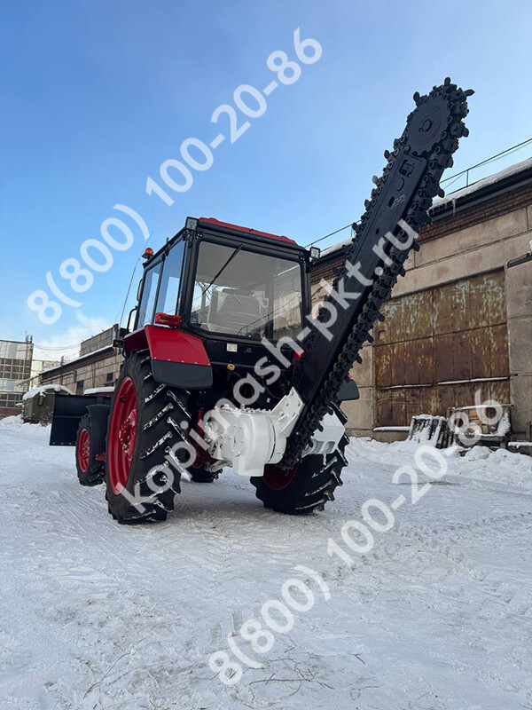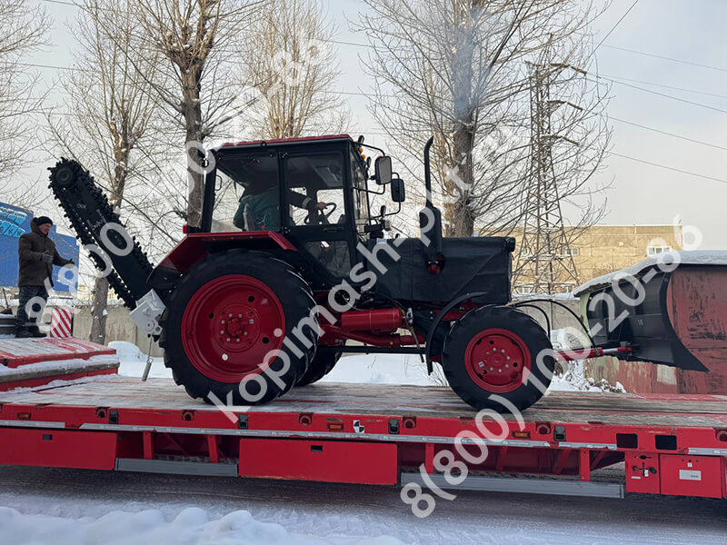 К нам обратился клиент с Иркутской области с запросом на машину для пиления льда. Пожелания по базовому трактору: стандартный МТЗ 82.1. По установке вариант требовался самый надежный, неубиваемый, поэтому комплектовали грунторезом 2086 глубиной копания 1,6 метра, шириной 140 мм, для самых сложных грунтов без шнекового узла, потому что при пилении льда шнеки не используются. Установили гидроходоуменьшитель ХД-5, дополнительную систему охлаждения масла трактора, спереди навесили гидроповоротный бульдозерный отвал для тяжелых работ.